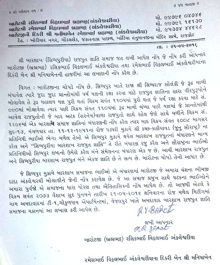 સંવત ૧૨૯૬ ની માગશર સુદ ૧૦ ને દિવસે (૭૭૮ વર્ષ પહેલા) સિધ્ધપુર મુકામે રાજ્પૂત જ્ઞાતિનો સમૂહમેળો ભરાયેલ, તે વખતે દરેક રાજપૂતો અર્થાત છત્રીસ પ્રકારના(શાખ) રાજપૂતો ભેગા થયાં હતા, તેમાંથી બાર પ્રકારના(શાખ) રાજપૂત પોતપોતાના મોભા અને જમીન - જાગીરને આધારે નોખા થયેલા અને એક સંગઠન બનાવેલ ત્યારથી બધો વહેવાર, દિકરા- દિકરીઓના વેવિશાળ કરવા વિગેરે બાબતોનો રેકર્ડ રાખવા તે વખતના અંકલેશ્વરના બારોટ ખેતાભાઈ સુત ભીમજીને બારોટ (અંકલેશ્વરીયાને) તરીકે સ્થાપેલ, અને બારશાખાના વંશાવલીના ચોપડાની આપ- લે કરેલ હતી, ત્યાર પછી બારોટના દિકરીને જામનગર પરણાવેલ. જેથી તેમને કાનમેરમાં રહેતા યજમાનના ઘર તેઓને આપેલ તથા ચોપડા પણ આપેલ હતાં. આમ બારશાખ રાજપૂત કૂળ અસ્તિત્વમાં આવેલ. વધુ જાણો